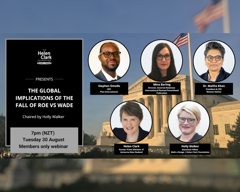 In this webinar our distinguished panel reflected on the global implications of the fall of Roe. It featured the Rt Hon Helen Clark in conversation with Mina Barling, Director for External Relations at International Planned Parenthood Federation, Stephen Omollo, CEO at Plan International, and Dr Maliha Khan, President & CEO of Women Deliver. The panel was chaired by long serving research fellow at the Helen Clark Foundation, Dr. Holly Walker.